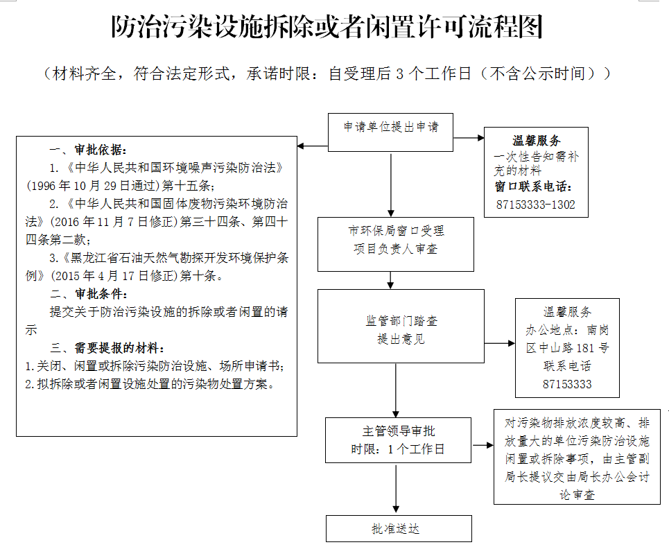 1.关于防治污染设施的拆除或者闲置的请示; 3.预防污染事故应急设施说明; 4.并网供热、污水集中处理协议书; 5.拆除或闲置污染防治设施后污染物排放种类、数量、浓度、去向和可能对环境产生的影响,以及计划采取控制或减少污染物排放的措施、预期效果分析报告; 6.需拆除或闲置设施工艺流程说明; 7.污染防治设施更新、改造、扩容的订购或施工合同。 |